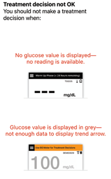 Pay close attention to your glucose values, symptoms, and trends. If your symptoms are different than the sensor glucose values or what the alert indicates, confirm your glucose value with a blood glucose meter test before making a treatment decision.*